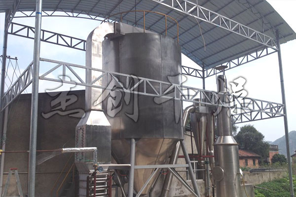 系統(tǒng)工作原理:空氣經(jīng)過濾和加熱,進入干燥器頂部空氣分配器,熱空氣呈螺旋狀均勻地進入干燥室。料液經(jīng)塔體頂部的高速離心霧化器,(旋轉)噴霧成極細微的霧狀液珠,與熱空氣并流接觸在極短的時間內可干燥為成品。成品連續(xù)地由干燥塔底部和旋風分離器中輸出,廢氣由風機排空。