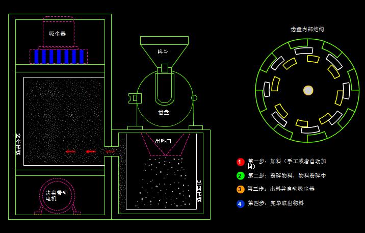 4、本機(jī)利用活動(dòng)齒盤和固定齒盤問的高速相對(duì)運(yùn)動(dòng),使被粉碎物經(jīng)齒沖擊、摩擦及物料彼此間沖擊等綜合作用獲得粉碎。