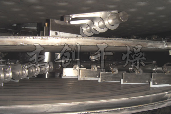 濕物料自加料器連續(xù)地加到干燥器上部一層干燥盤上,帶有耙葉的耙臂作回轉(zhuǎn)運動使耙臂作回轉(zhuǎn)運動使耙葉連續(xù)地翻抄物料。物料沿指數(shù)螺旋線流過干燥盤表面,在小干燥盤上的物料被移送到外緣,并在外緣落到下方的大干燥盤外緣,在大干盤上物料向里移動并從中間落料口落如下一層小干燥盤中。大小干燥盤上下交替排列,物料得以連續(xù)地流過整個干燥器。中空的干燥盤內(nèi)通入加熱介質(zhì),加熱介質(zhì)形式有飽和蒸汽、熱水和導熱油,加熱介質(zhì)由干燥盤的一端進入,從另一端導出。已干物料從上面一層干燥盤落到殼體的底層,被耙葉移送到出料口排出。濕份從物料中逸出,由設在頂蓋上的排濕口排出,真空型盤式干燥器的濕氣由設在頂蓋上的真空泵口排出。從底層排出的干物料可直接包裝。通過配加翅片加熱器、溶劑回收冷凝器、袋式除塵器、干料返混機構(gòu)、引風機等輔機,可提高其干燥的生產(chǎn)能力,干燥膏糊狀和熱敏性物